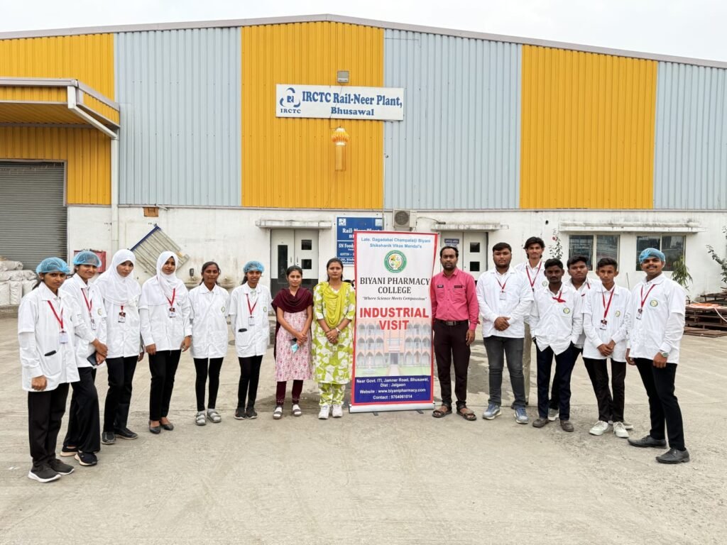 Students of Biyani Pharmacy College visited the IRCTC Rail Neer Plant located in Bhusawal, District Jalgaon, Maharashtra. Operated by the Indian Railway Catering and Tourism Corporation (IRCTC), the visit provided students with valuable insights into the large-scale purification, packaging, and quality control processes involved in producing safe drinking water for railway passengers.
