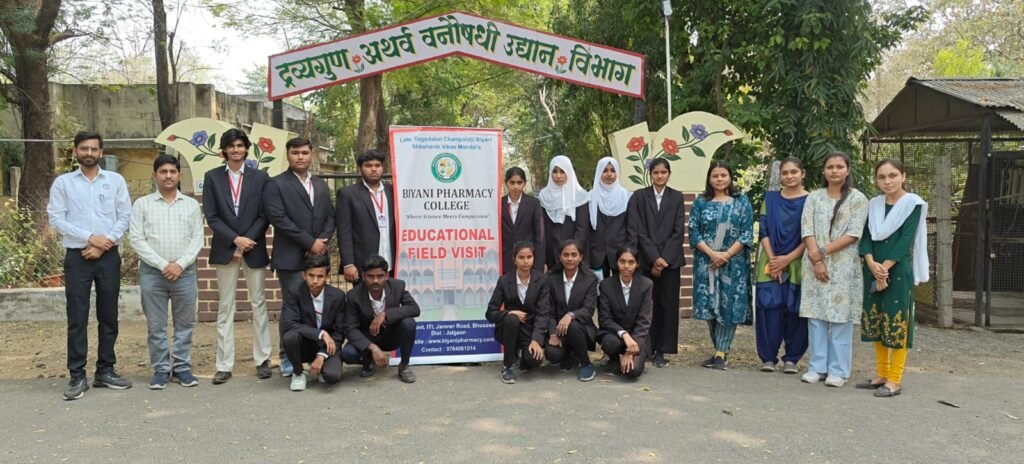 Students of Biyani Pharmacy College visited the herbal garden at Chaitanya Ayurved Mahavidyalaya, located at тАЬChaitanyavanтАЭ, National Highway No. 6, Sakegaon, Taluka Bhusawal, Dist. Jalgaon, Maharashtra. The visit provided students with valuable knowledge about medicinal plants, their identification, cultivation, and therapeutic uses in Ayurveda, enhancing their understanding of herbal medicine and natural drug sources.